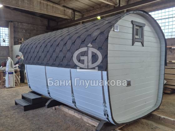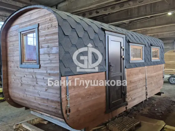 Дизайнерская баня бочка с длинным панорамным окном в длину крыши