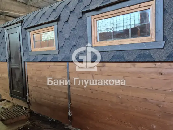 Более «пряночного» проекта у нас нет! Красивая эффектная перевозная баня каркасной сборки с округлой крышей и роскошными арочными окнами.