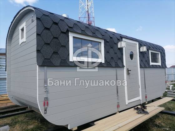 Перевозные и стационарные бани каркасной сборки необычной формы, напоминающей гусеницу танка. Шикарное панорамное остекление. Авторское право №016-005987.