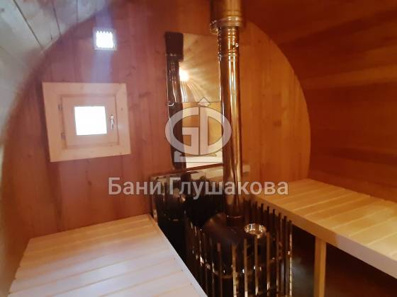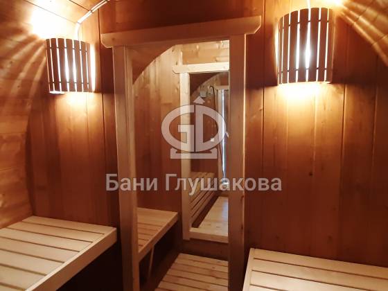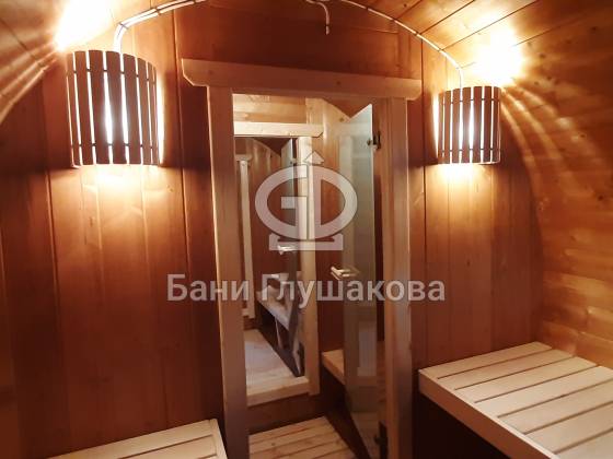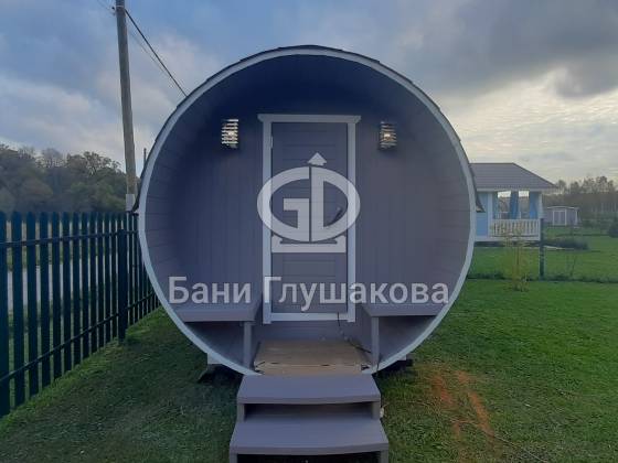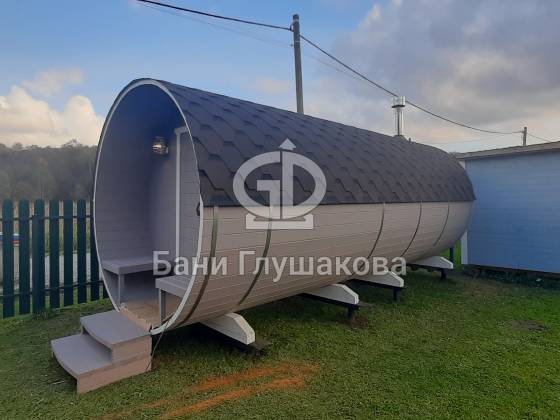 Эта круглая красавица — идеальный вариант для тех, кто ценит эстетику классической бани-бочки, но хочет получить современный комфорт и долговечность конструкции.
