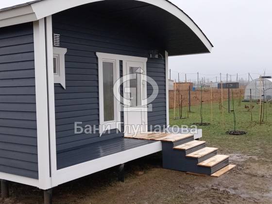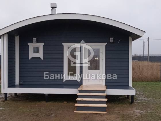 Глубокий тёмно-синий оттенок подчёркивает форму, делает баню визуально дорогой и благородной, а белая окантовка добавляет аккуратности и чистоты линий. Вечером, когда включается мягкий свет, баня будто растворяется в сумерках и выглядит особенно уютно — точно маленький домик, где всегда тепло и спокойно.
