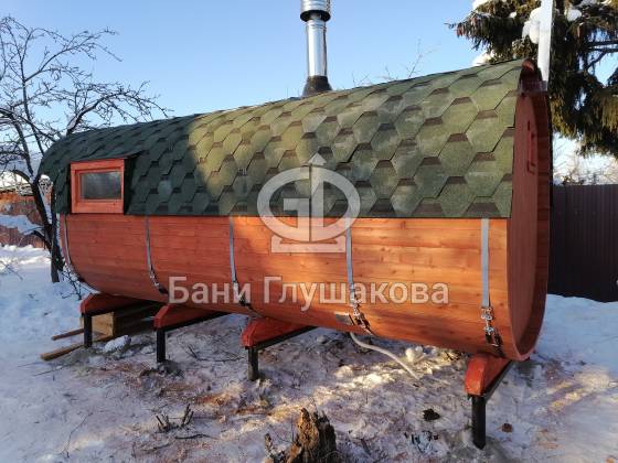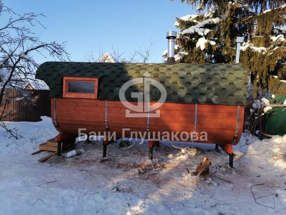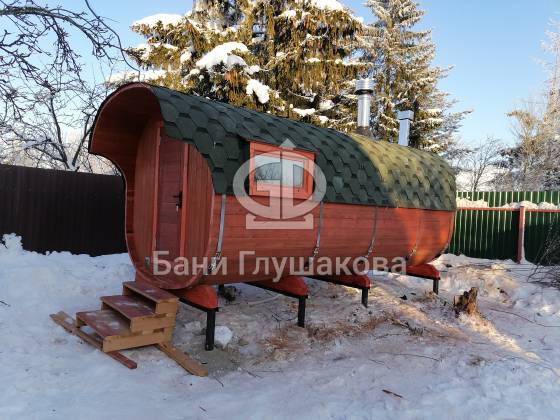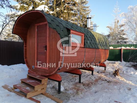 Комплектация: Баня установлена на надежный свайный фундамент, оснащена печью с баком для воды и полностью готова к эксплуатации сразу после монтажа.