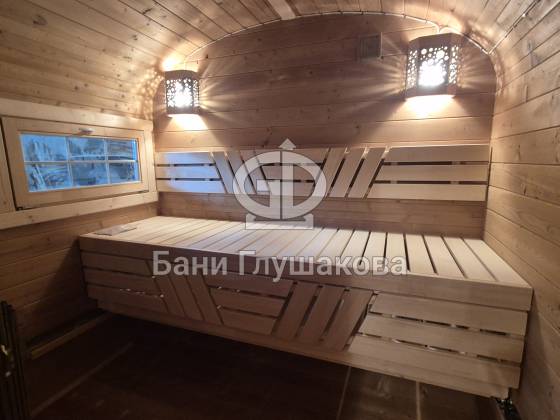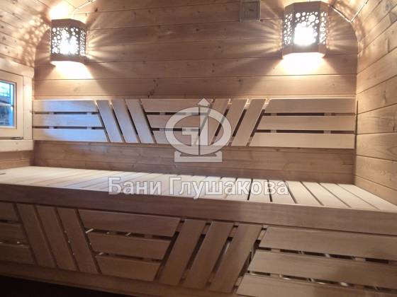 Эргономика парной. Внутри установлены широкие удобные полки и качественное оборудование, обеспечивающее мягкий и глубокий прогрев.
