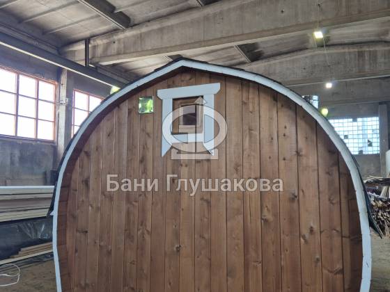 Баня выполнена из бочковой термодоски, что гарантирует её долговечность, стойкость к гниению и стабильность геометрии на долгие годы. Для фасада Заказчик выбрал благородный темный оттенок «Орех», который выигрышно контрастирует с белыми наличниками на окнах и дверях, придавая бане вид.