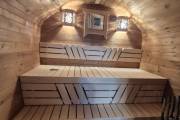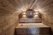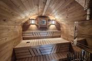 В парной — очень удачная расстановка: широкие полки стоят углом, а печь сбоку.