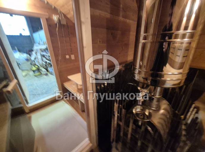 Баня сделана из отсортированной термодоски — мы отобрали хорошее дерево, но с небольшими косметическими изъянами. Ничего критичного, просто живой материал с характером.