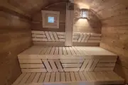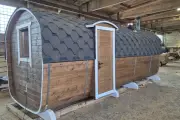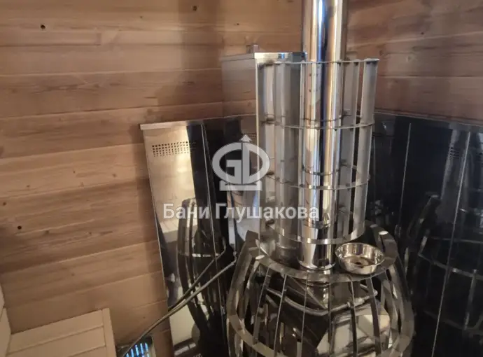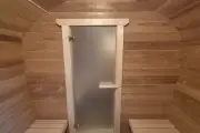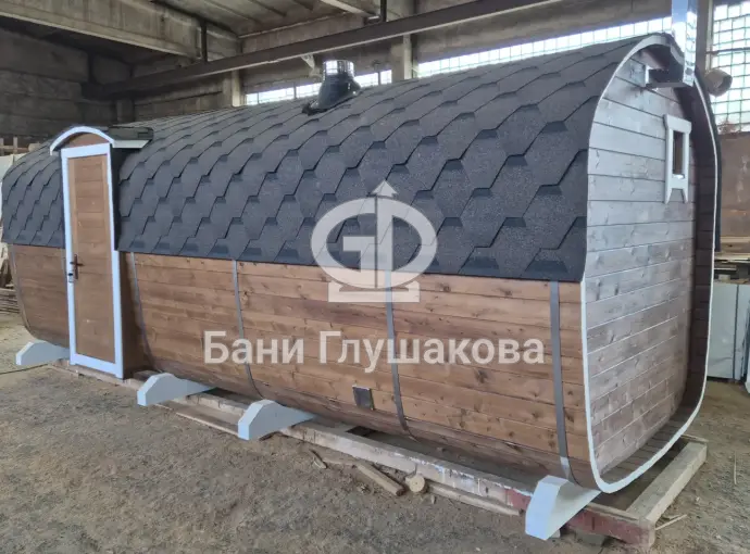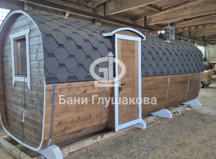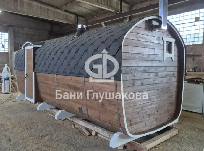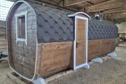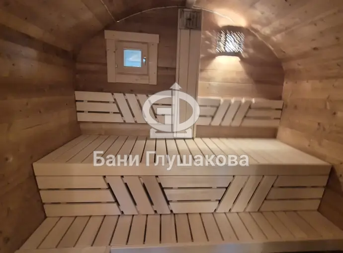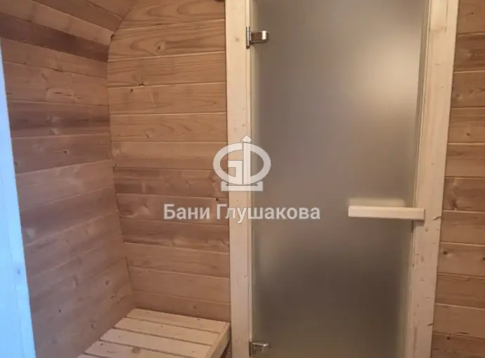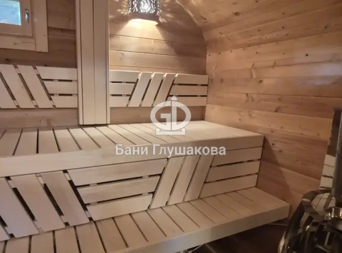 Баня сделана из бочковой термодоски, которая идеально подходит для строительства бань-бочек – она не набирает влагу и не рассыхается при смене сезонов. Подтягивать эту баню не нужно.
