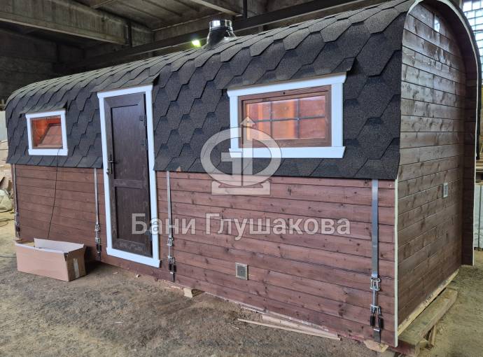 Вашему вниманию предлагаем новинку – перевозную баню «Буханочка» из бочковой термодоски. По сути это гибрид «Кареты» и «Буханочки».