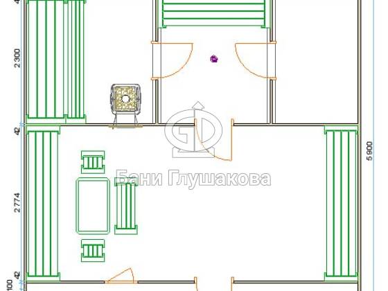 Предбанник размером 2,3 × 3 метра служит переходной зоной между улицей и комнатой отдыха: здесь можно снять обувь и верхнюю одежду, не занося влагу и грязь внутрь. Также это отличное место для хранения аксессуаров, дров и банных принадлежностей.