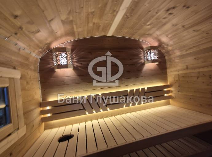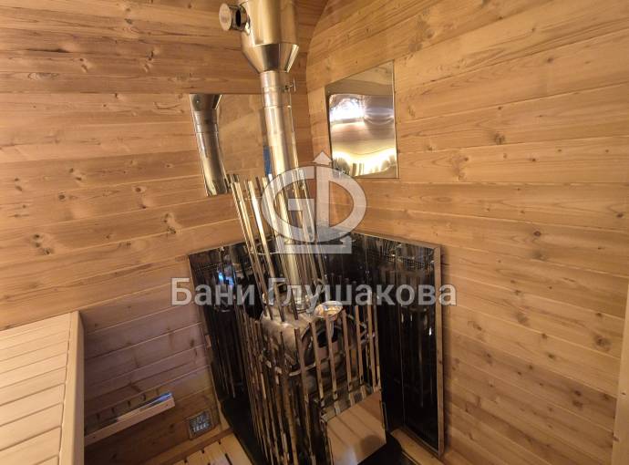 Баня выполнена из бочковой термодоски — материала, устойчивого к влаге, температурным перепадам и деформации. Такая конструкция остаётся лёгкой, но при этом тёплой и долговечной.
