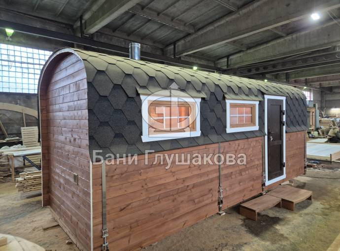 Баня «Буханочка» из бочковой термодоски 6х5,9 с предбанником