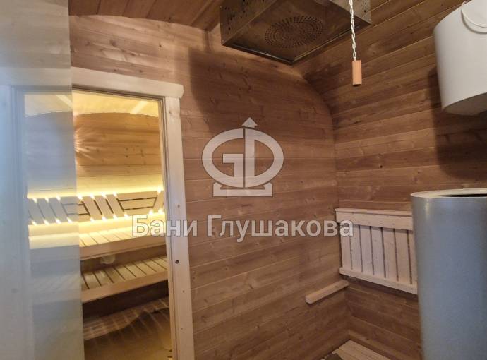 Благодаря конструкции из бочковой термодоски баня сочетает лёгкость сборки, устойчивость к влаге и температурным перепадам, а утеплённый пол делает её подходящей для круглогодичного использования.