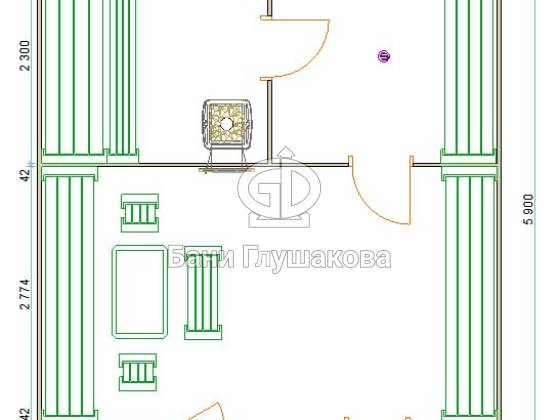 Стандартный размер проекта — 5×6 метров, однако габариты можно изменить под индивидуальные требования заказчика. Внутренняя планировка включает четыре помещения: просторную комнату отдыха, душевую, парную и отдельный санузел.