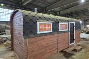 Баня изготавливается из бочковой термодоски — материала, устойчивого к перепадам температур и влаге. Она остаётся лёгкой по конструкции, но при этом рассчитана на круглогодичное использование.