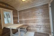 Размер 2,2х6 метров. Внутри 3 помещения: комната отдыха, помывочная и душ. Комплектация топ: обливное устройство «Обливасту», вентиляция «Второе дыхание» и «Димасту», металлический экран вокруг печи и удобные клапаны-задвижки. В общем, эта банька собрала в себе все наши последние улучшалки.