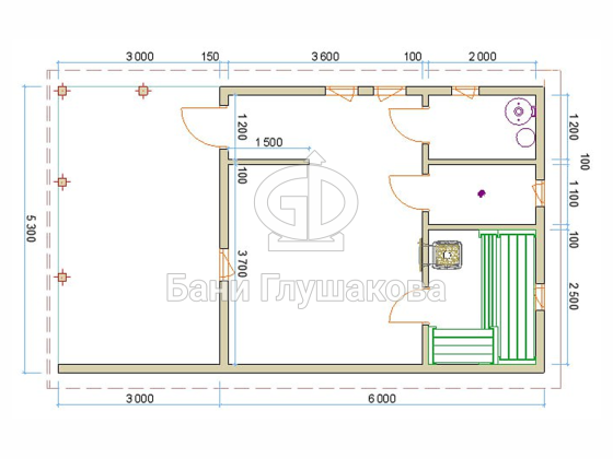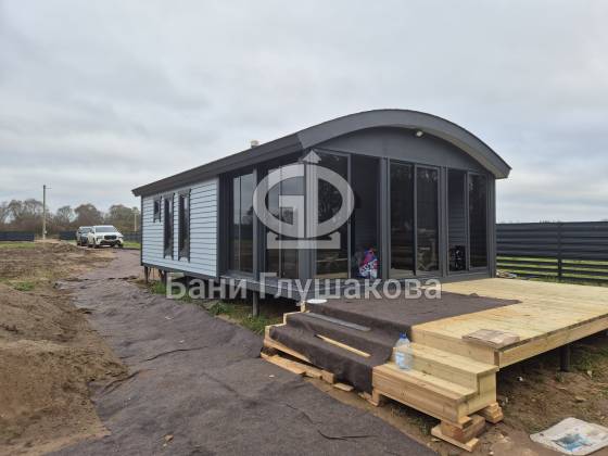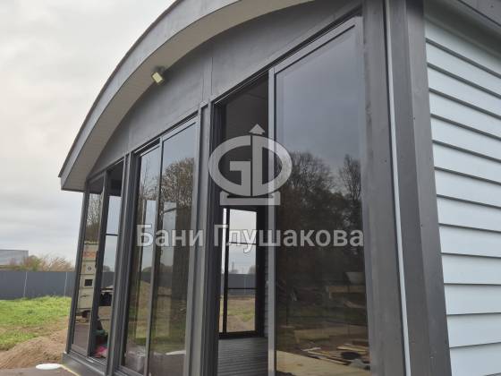 Несмотря на уменьшенные габариты, мы сохранили фирменный силуэт с округлой крышей, который делает эту баню похожей на сказочный домик. Проект выполнен из клееного бруса, что гарантирует долговечность, прочность и минимальную усадку.