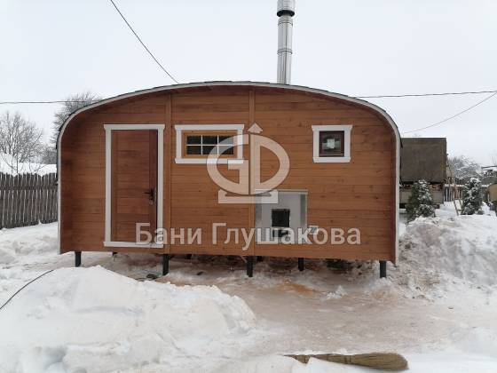 Мобильные бани стали серьезной альтернативой обычным стационарным: они и значительно дешевле, и строятся быстрее. А если учесть, что сборка осуществляется в условиях цеха и баня приезжает на участок в уже готовом виде, то преимущества даже перевешивают. Для тех, кто все еще сомневается в целесообразности таких проектов, представляем мобильную баню «Брянск» каркасной сборки под ключ.