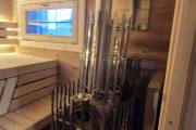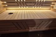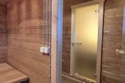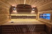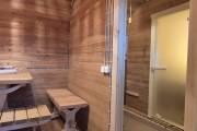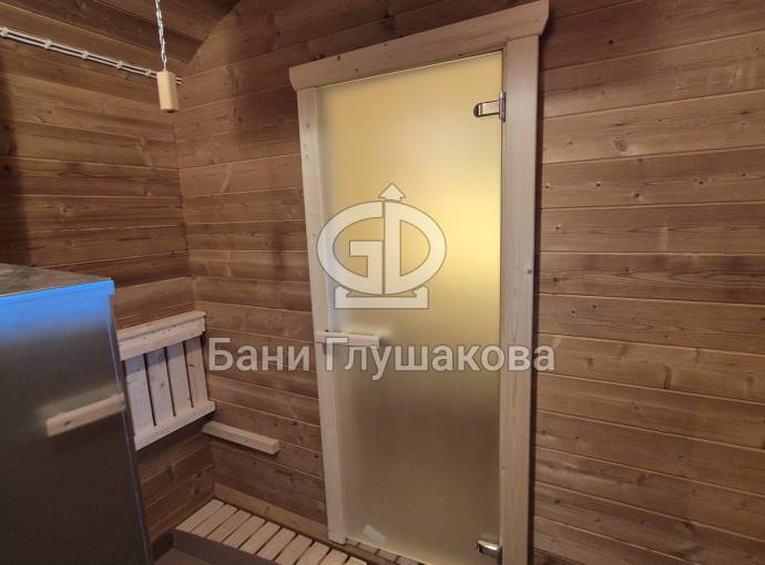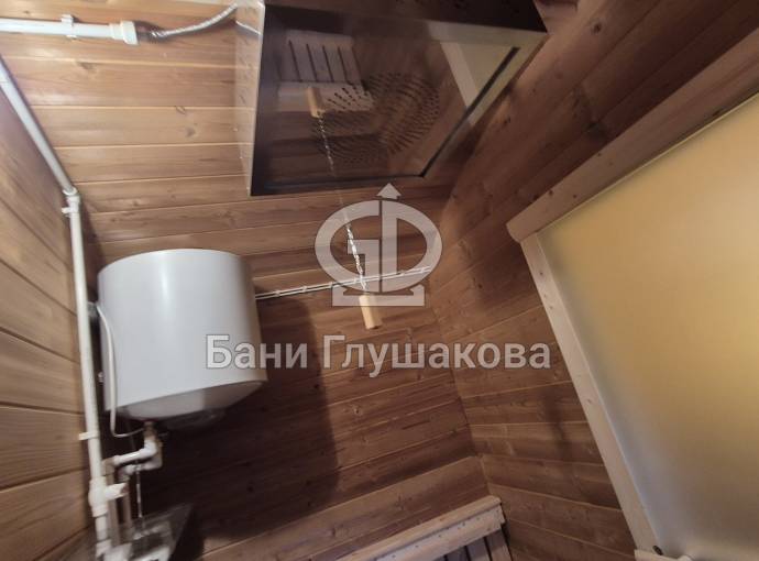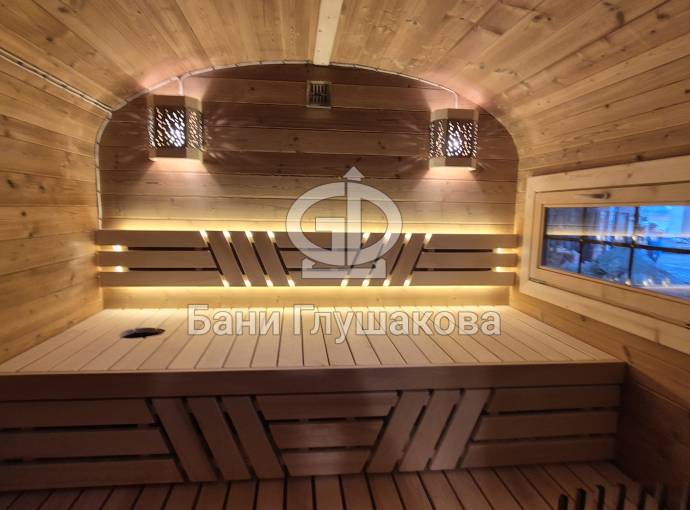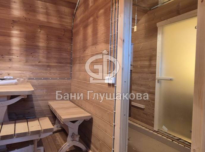 Размер 2,4 на 6 метров, 3 отделения – комната отдыха, душевое помещение, парная.