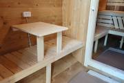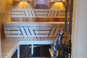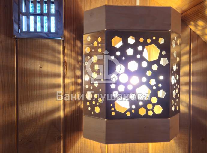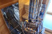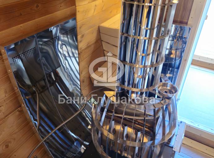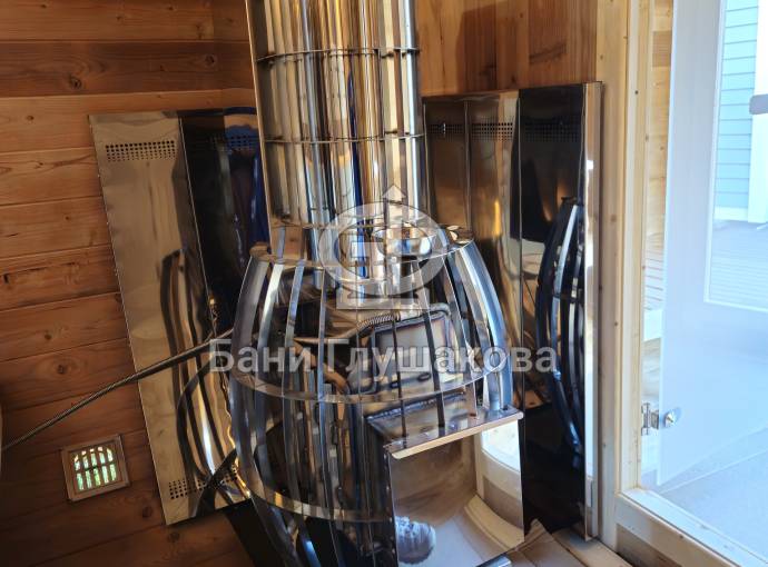 В стоимость уже входит сборка, печь нашего производства с двумя каменками и парогенератором, электрика, металлические уличные светильники, ступеньки. Вокруг печи стоит металлический экран. Установлены металлические комплектующие из нержавейки: вентиляционные клапаны-задвижки, крепления для проводки, наличник на форточку и порожек между помещениями. Ступеньки тоже уже входят в стоимость. Замечательная расстановка в парной: широкие полки поставлены углом, а печь сбоку. Поверьте нашему многолетнему опыту — это и правда самый удобный вариант.