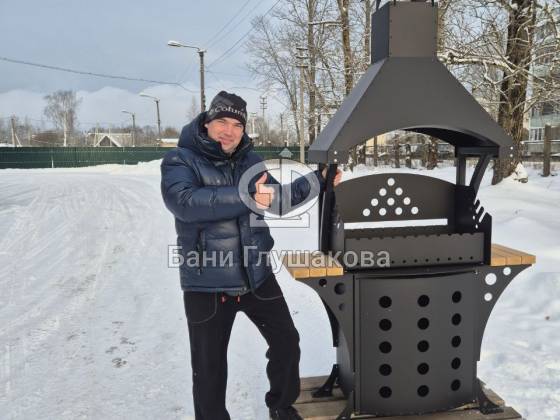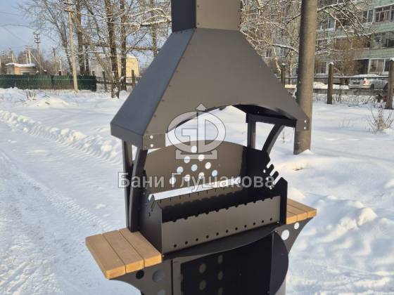 Вытяжной зонт (крыша): Массивный купол не только защищает зону готовки от осадков, но и эффективно отводит дым. Ваша одежда и гости на террасе будут защищены от гари.
