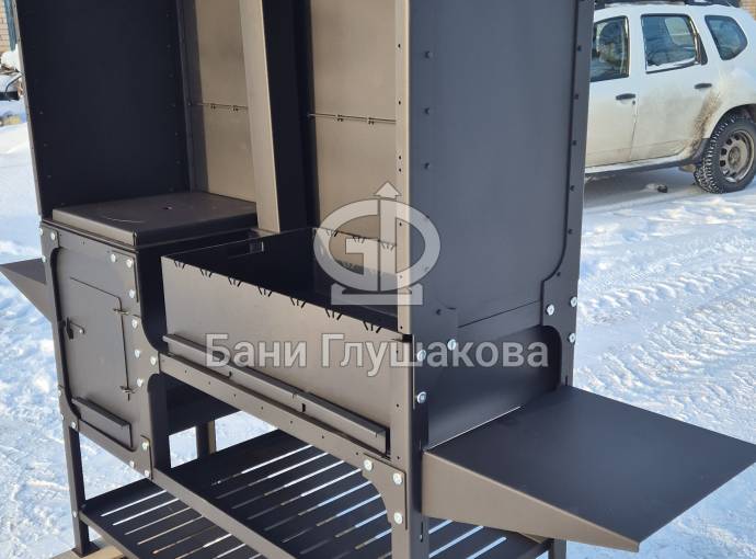 Продуманная эргономика: Мы предусмотрели боковые столики для посуды и специй, а также вместительную нижнюю полку для хранения дров и угля. Всё необходимое всегда под рукой.
