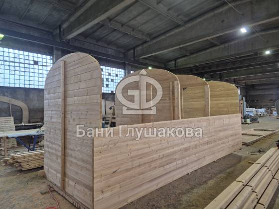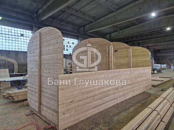 Изящные бани с фирменной округлой крышей и галереей высоких окон. Строим по каркасной технологии или из бруса на выбор.